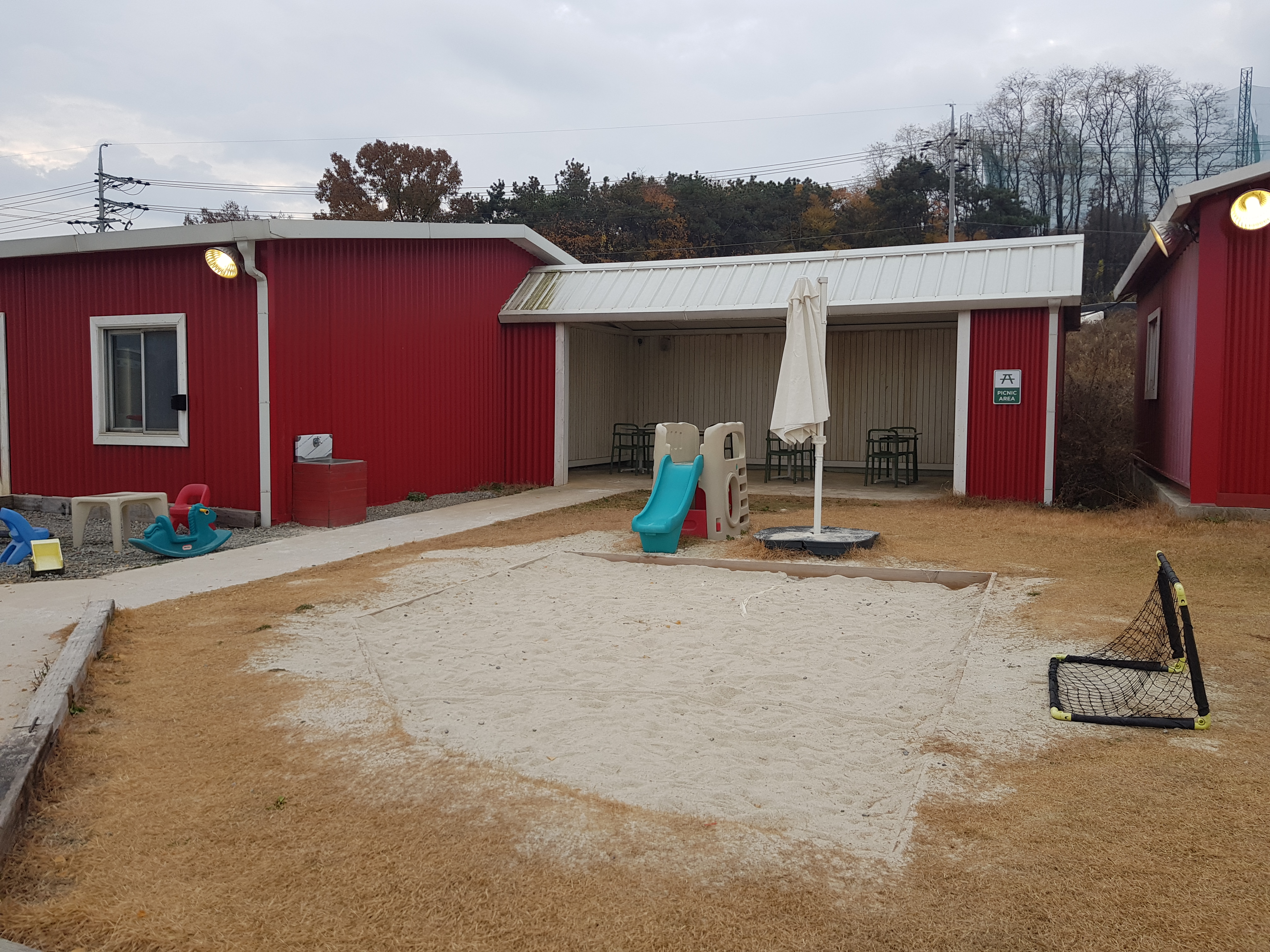 밖에는 모래 놀이터가 있었는데, 이날은 날씨가 다소 흐리고 시간이 애매해서 사람이 많지 않았다. 아이들 놀이와 캠핑 분위기를 겸하여 가족이 함께 오는 것도 좋은 선택이 될 것 같다.