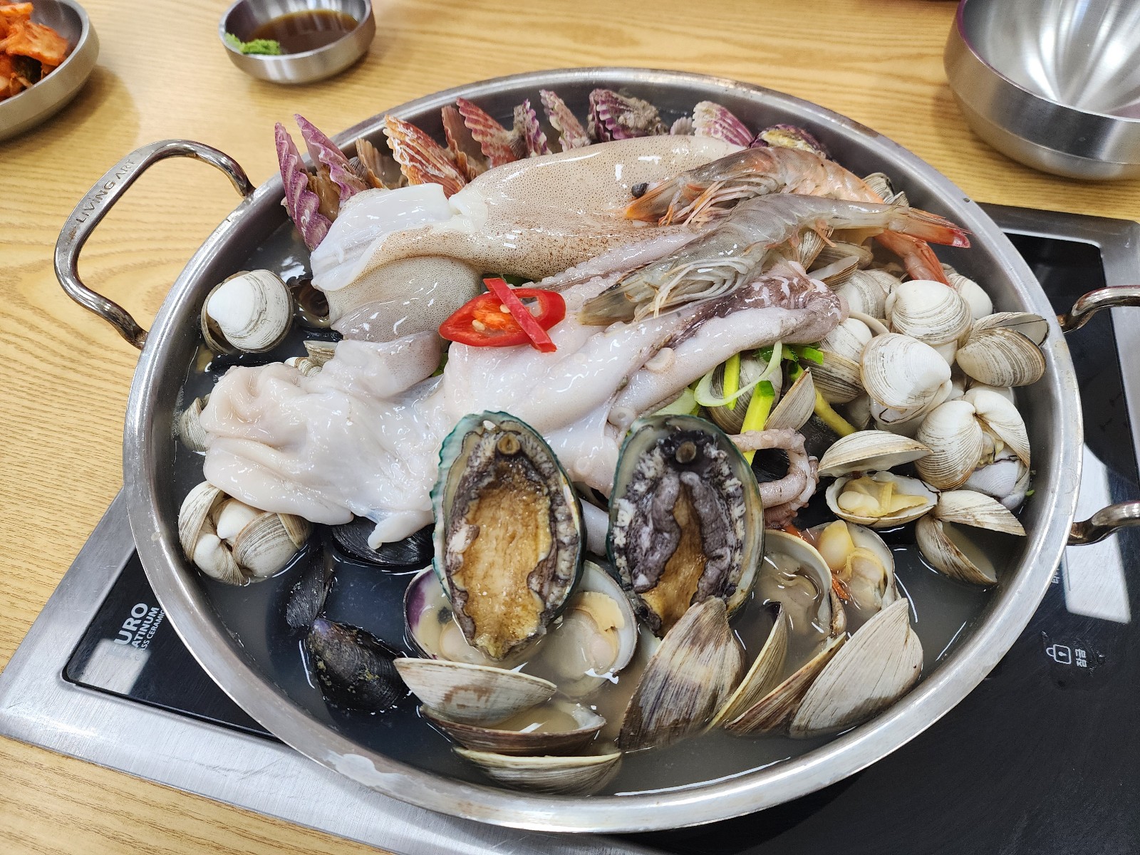 주문하면 테이블에 놓인 해물칼국수 비주얼이 상당하다. 양도 그렇지만 해물의 다양성이 감탄을 자아낸다.