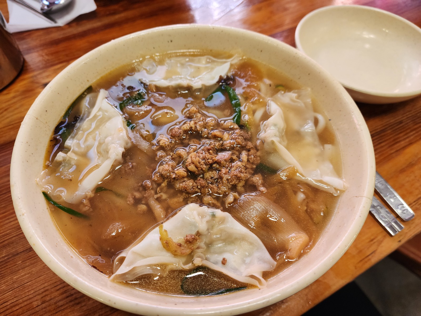 고기 미찌, 교자 만두, 구운 양파 등등... 불맛이 살짝 나는 칼국수다. 국물이 좋다. 향이 마치 과거의 추억을 부르는 느낌이 든다.