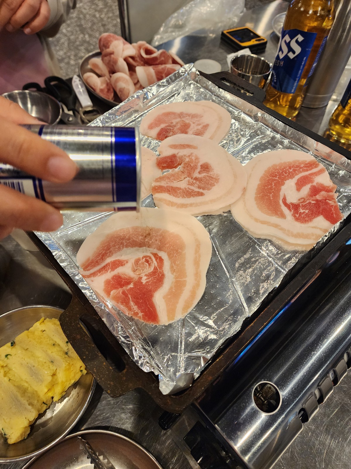 맛소금과 후추를 '톡톡' 뿌려주며 빠르게 냉삼을 굽는다. 적당한 바삭함과 촉촉함의 경계를 잘 아우를 수 있도록 굽고 한 점을 맛보며 이야기 시작. (역시 회사의 뒷담화를 시작하니 술도 후루룩 시간도 후루룩이다. 훗!)