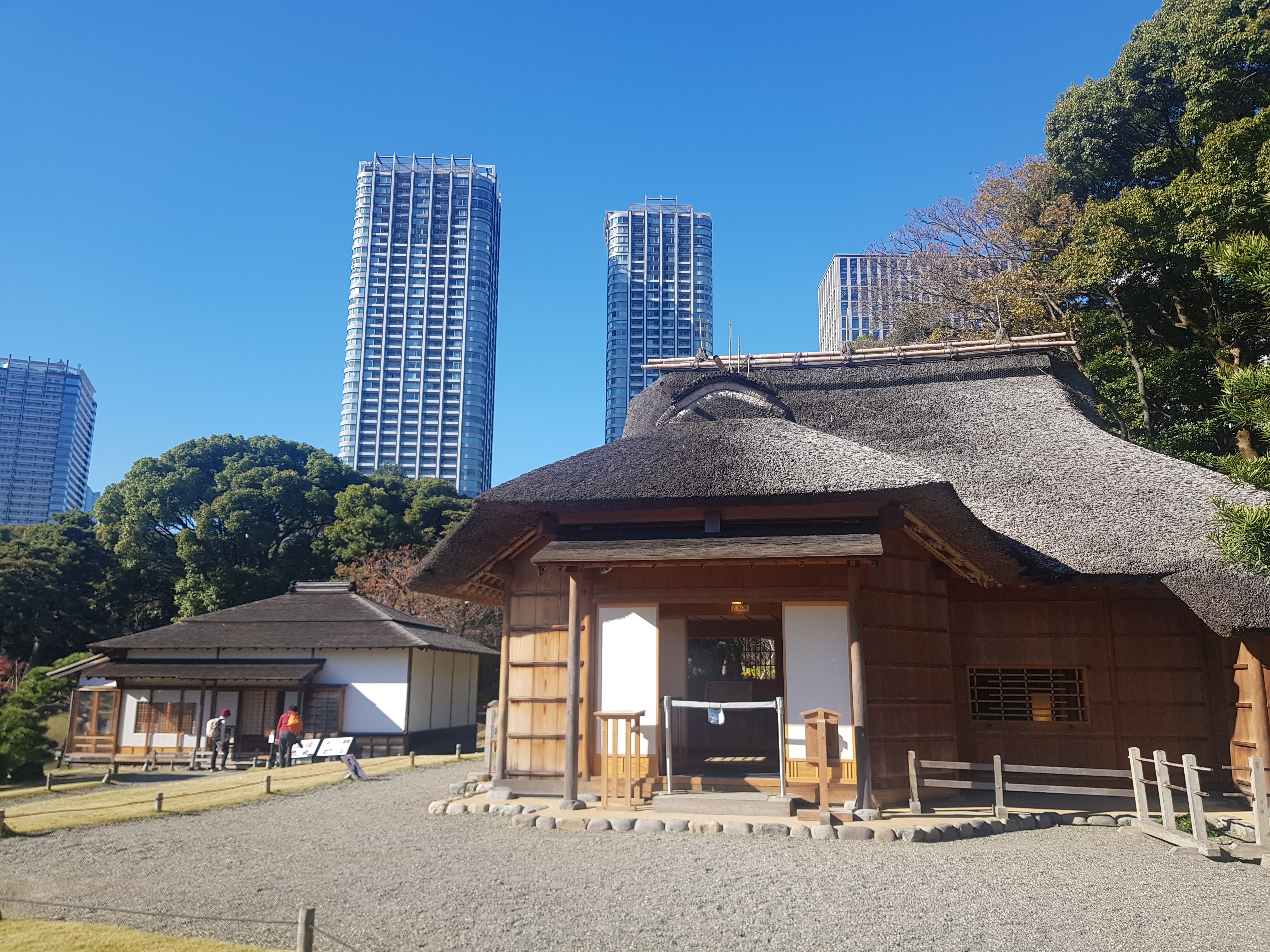 시장에서만 이것저것 먹다 보니 소화를 위해 계획에 없던 근처 하마리큐 은사정원까지 걸어갔다. 입장료를 내야 하는데 생각보다 옛날 일본 가옥을 스타일을 구경할 수도 있고 조경도 잘해 놔서 인상적이었다. 시대에 따라 지붕의 변화가 눈에 띄는데 재미있었다. 300엔의 입장료를 내지만, 츠키시 시장에서 배 부르게 먹고 산책하는 기분으로 들리기에 그만이다.