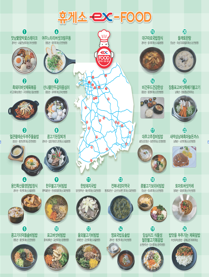 총 24개의 휴게소를 선정했다고 하는데 개인적으로 가장 먹어 보고 싶은 것은 12번 울외불고기 비빔밥과 20번 들깨토란탕. 다른 것들도 맛있어 보이지만 들깨를 워낙 좋아기도 하고 토란을 넣으면 무척 잘 어울 릴 것 같다. 또, 울외 비빔밥은 울외 장아찌와 함께 비빔밥을 먹는다니 맛이 없을 수가 없을 듯하다.