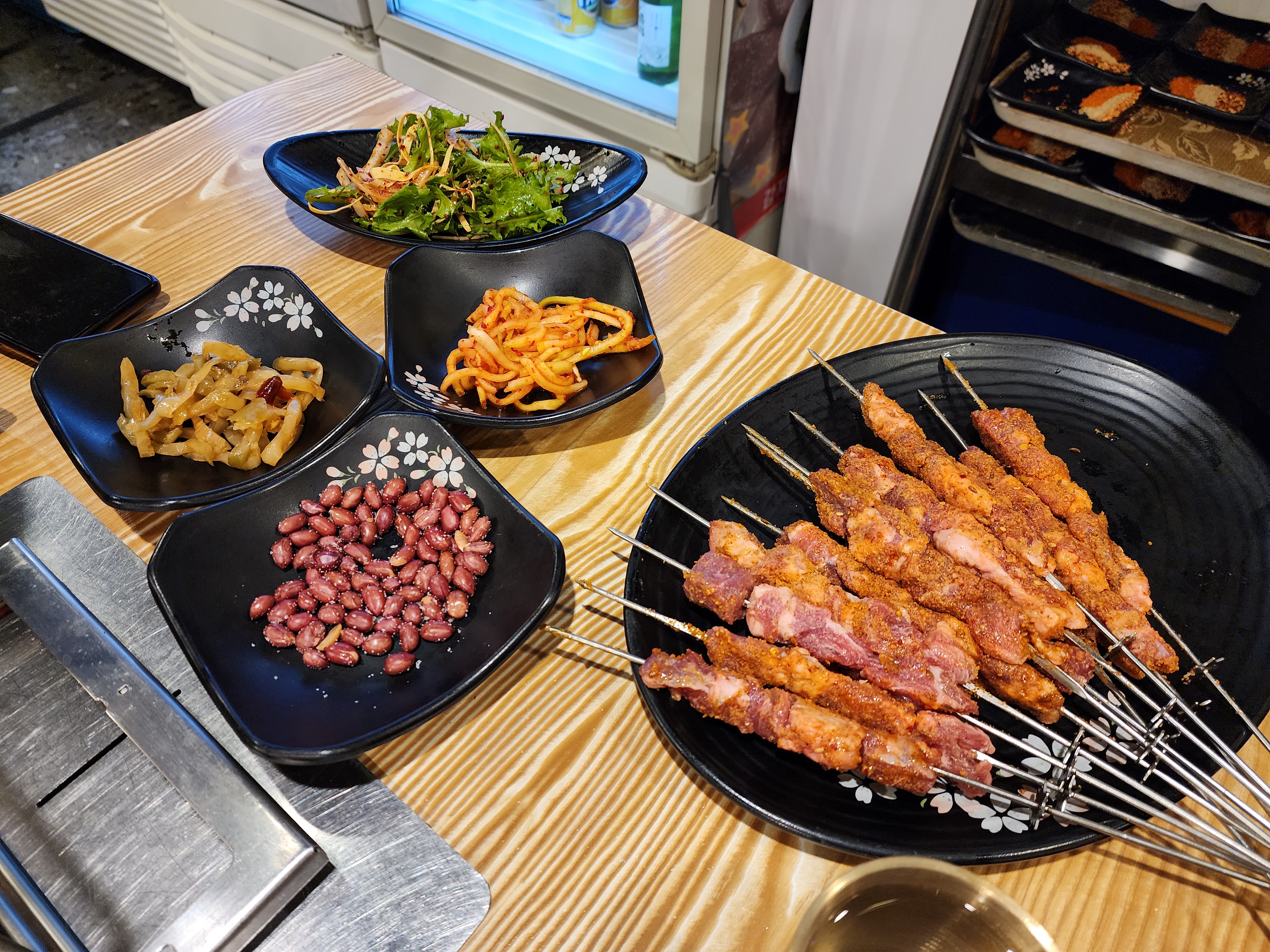 양꼬치 집에 보통 2명이 오면, 기본 메뉴는 양꼬치 2인분에 꿔바로우가 가장 보편적.
